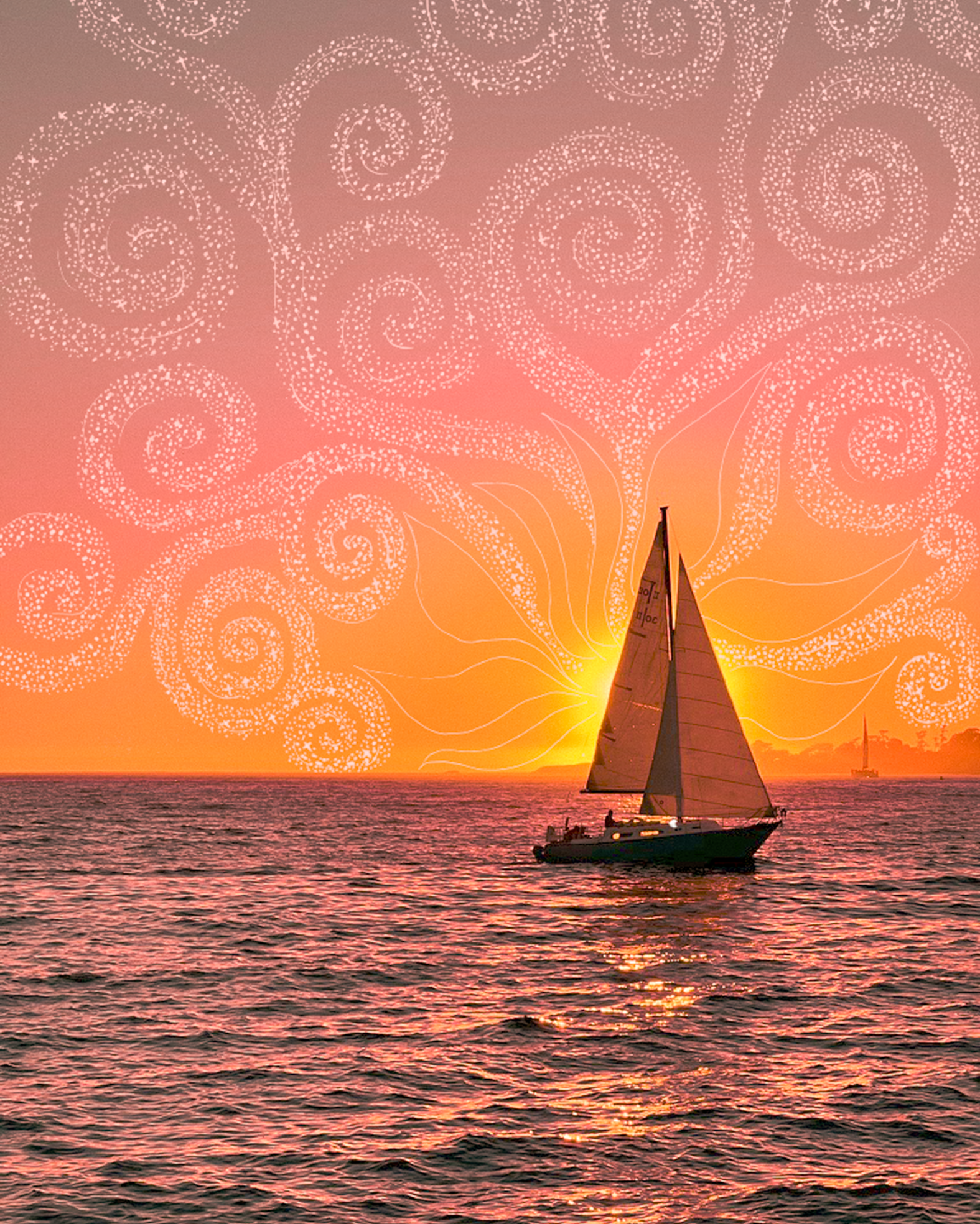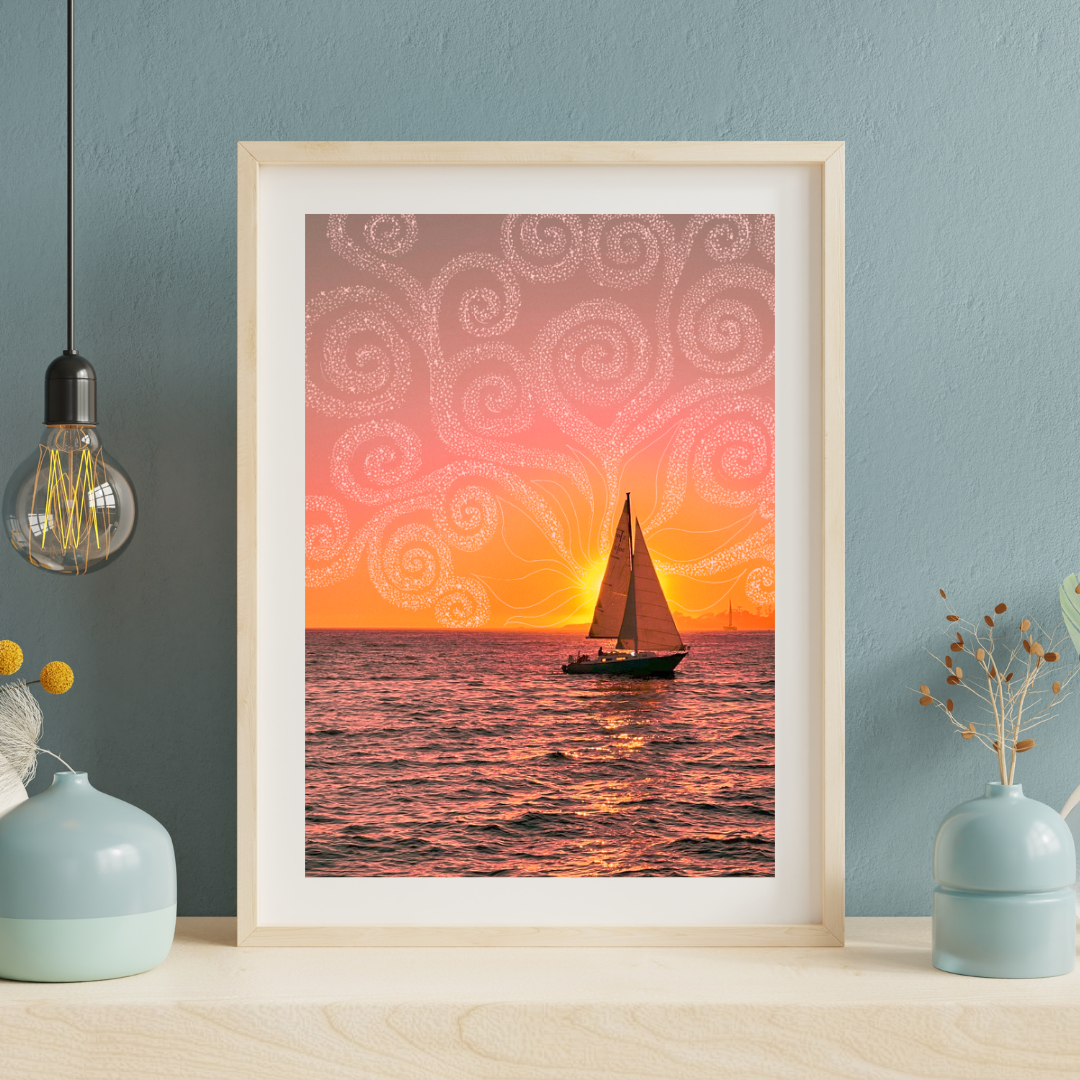 A summer sunset on Monterey Bay in Santa Cruz, CA. This piece is a combination of digital art and photography.