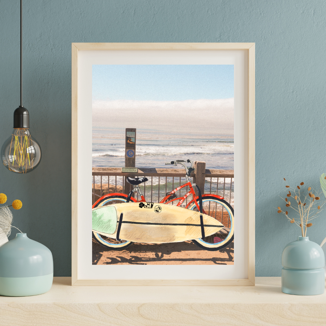 Overlooking the iconic surf spot in Santa Cruz, CA, on a sunny Sunday morning. This piece is a combination of original watercolor art and photography (shot on Sony A6700).